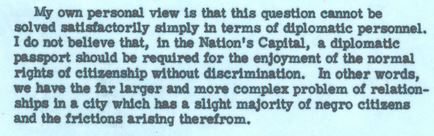 Over at The Text Message, a blog by archivists at the U.S. National Archives, archivist David Langbart has a couple of posts that will be of interest to civil rights, constitutional law and foreign relations scholars, as well as historians. The most recent is Foreign Diplomats and Domestic Discrimination, and it includes a digitized letter from Secretary of State Dean Rusk to Attorney General Robert Kennedy, January 31, 1961. The topic is race discrimination in Washington DC against foreign diplomats. Rusk writes in part: Wednesday, September 09, 2015